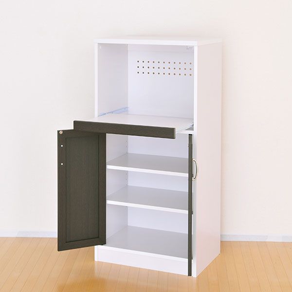 お客様組立品サイズ:幅580×奥行398×高1200mm重量:約23.2kg材質:[本体]プリント紙化粧板カラー:[本体]ホワイト[前板]ブラウン(濃いめ)耐荷重:[天板]約20kg[棚板]約7kg [スライド棚]約5kg備考:可動棚2枚、2口コンセント付きスライドレール棚コロ式※沖縄・離島は送料別途お見積もりさせていただきます。